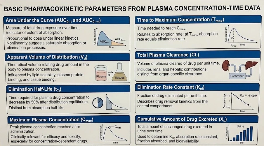 For better understanding, we will explain the terminology of the Basic pharmacokinetic parameters obtained from plasma concentrations after an administration of a drug: