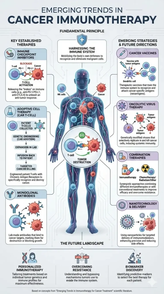 Immunotherapy has revolutionized oncology, leveraging the patient’s immune system for specific and durable responses against various malignancies. This article provides an overview of emerging trends in immunotherapy, exploring its historical evolution, diverse mechanisms, and the latest advancements. We delve into key immunotherapeutic strategies like immune checkpoint inhibitors, adoptive cell therapies, cancer vaccines, and oncolytic viruses, highlighting their clinical impact.